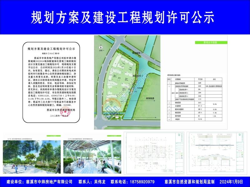 慈溪市中帅房地产有限公司拟申请办理慈城南202201#地块配建绿化景观工程的规划设计方案及建设工程规划许可。现将规划方案予以公示。公示时间自2024年1月10日起十日内,如有意见、建议,请在公示期间来电或来信到市行政服务中心自然资源和规划窗口。涉及重大利害关系的,利害关系人如需申请听证,请在公示结束前向我局提出申请,听证申请人须提供姓名、住址、电话号码、身份证号码、签名及证明利害关系等事项的书面材料。若无异议,我局将依申请办理规划设计方案及建设工程规划许可证。市自然资源和规划局联系电话:63961126、63961739(上午8:00-11:30,下午1:30-4:30,节假日除外),来信请寄:慈溪市三北大街777号慈溪市行政服务中心自然资源和规划局窗口,邮编:315300。