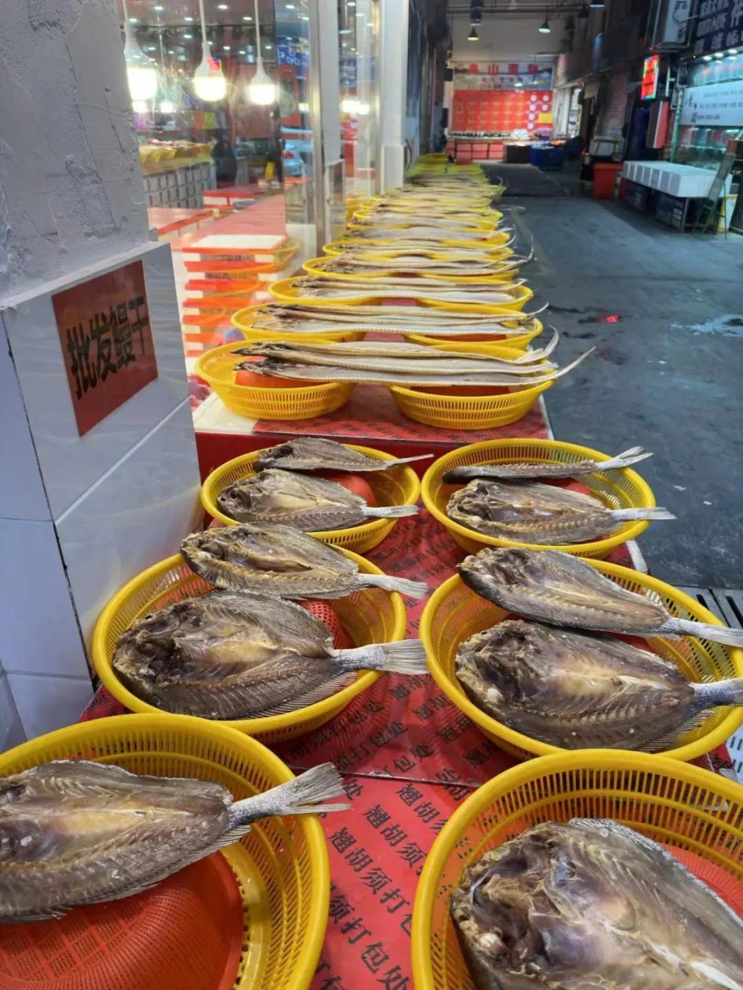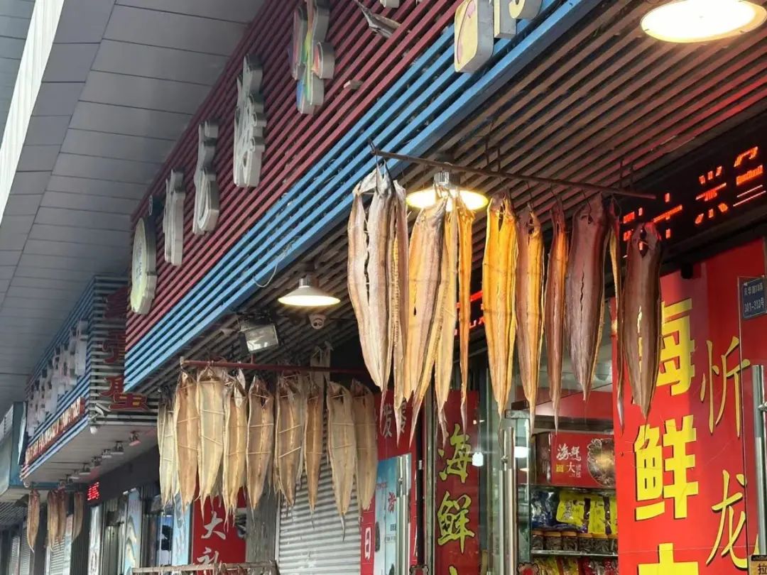 一条条扁平状的鳗鲞在风中晾晒,一箱箱烤制的大虾干泛着光泽,肥壮的红膏蟹张牙舞爪,冰沙中闪现通体金黄的大黄鱼、红通通的东星斑、闪着银光的鲳鱼……