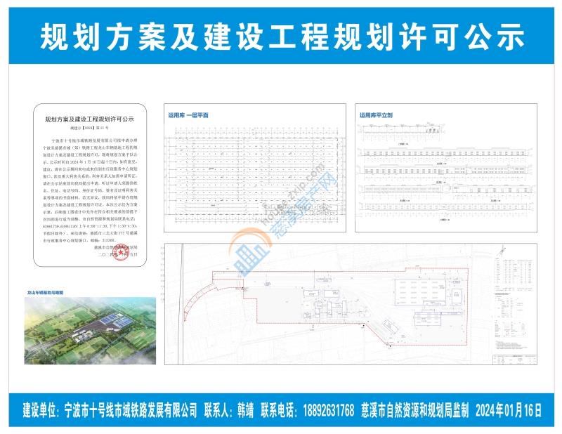 宁波市十号线市域铁路发展有限公司拟申请办理宁波至慈溪市域(郊)铁路工程龙山车辆基地工程的规划设计方案及建设工程规划许可,现将规划方案予以公示。公示时间自2024年1月16日起十日内,如有意见、建议,请在公示期间来电或来信到市行政服务中心规划窗口。涉及重大利害关系的,利害关系人如需申请听证,请在公示结束前向我局提出申请,听证申请人须提供姓名、住址、电话号码、身份证号码、签名及证明利害关系等事项的书面材料。若无异议,我局将依申请办理规划设计方案及建设工程规划许可证。本次公示仅为方案示意,后续施工图设计中允许在符合相关要求的前提下对局部进行适当调整。市自然资源和规划局联系电话:63961739、63961126(上午8:00-11:30,下午1:30-4:30,节假日除外),来信请寄:慈溪市三北大街777号慈溪市行政服务中心规划窗口,邮编:315300。