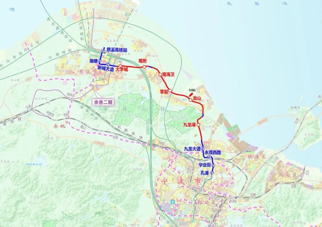 市域铁路慈溪线起于江北孔浦站,与2号线孔浦站换乘,经江北城区、镇海城区、九龙湖镇、龙山、掌起、观海卫、慈溪城区,终至慈溪高铁站。