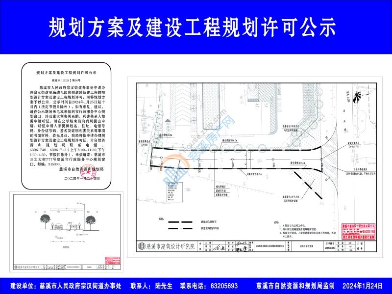 慈溪市人民政府宗汉街道办事处申请办理宗汉街道星海幼儿园东侧道路新建工程的规划设计方案及建设工程规划许可,现将规划方案予以公示。公示时间自2024年1月25日起十日内(法定节假日除外),如有意见、建议,请在公示期间来电或来信到市行政服务中心规划窗口。涉及重大利害关系的,利害关系人如需申请听证,请在公示结束前向我局提出申请,听证申请人须提供姓名、住址、电话号码、身份证号码、签名及证明利害关系等事项的书面材料。若无异议,我局将依申请办理规划设计方案及建设工程规划许可证。市自然资源和规划局联系电话:63961748、63961711(上午8:00-11:30,下午1:30-4:30,节假日除外),来信请寄:慈溪市三北大街777号慈溪市行政服务中心规划窗口,邮编:315300。