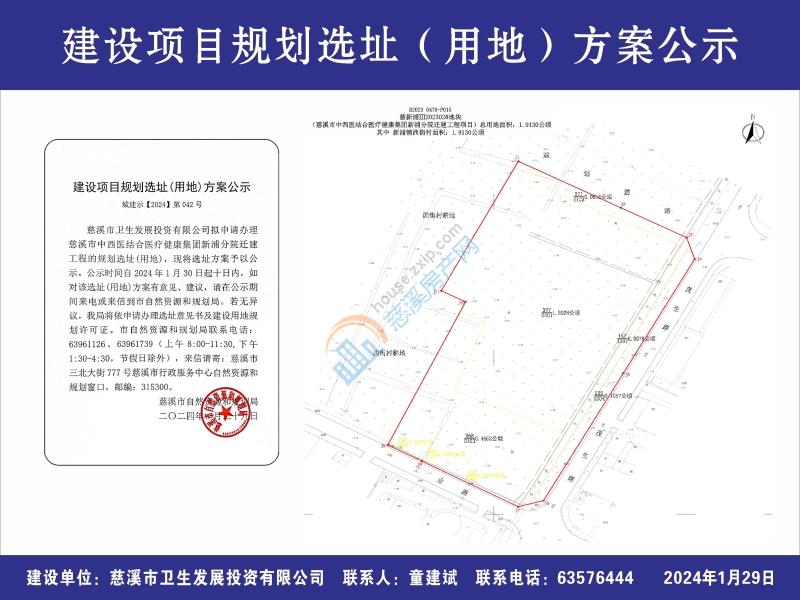 慈溪市卫生发展投资有限公司拟申请办理慈溪市中西医结合医疗健康集团新浦分院迁建工程的规划选址(用地),现将选址方案予以公示。公示时间自2024年1月30日起十日内,如对该选址(用地)方案有意见、建议,请在公示期间来电或来信到市自然资源和规划局。若无异议,我局将依申请办理选址意见书及建设用地规划许可证。市自然资源和规划局联系电话:63961126、63961739(上午8:00-11:30,下午1:30-4:30,节假日除外),来信请寄:慈溪市三北大街777号慈溪市行政服务中心自然资源和规划窗口,邮编:315300。
