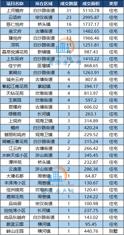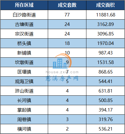 其中,白沙路街道以月成交77套居于榜首,其次是古塘街道和宗汉街道以24套的成交量并列第二。