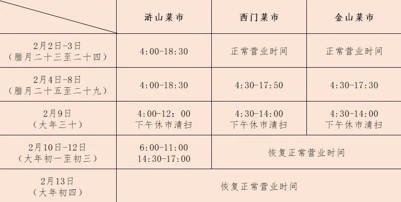 浒山、西门、金山菜市春节营业时间调整通知为了更好地满足广大消费者的购物需求,欢度春节,慈溪工贸集团现对城区三家农贸市场春节前营业时间作出相应优化调整: