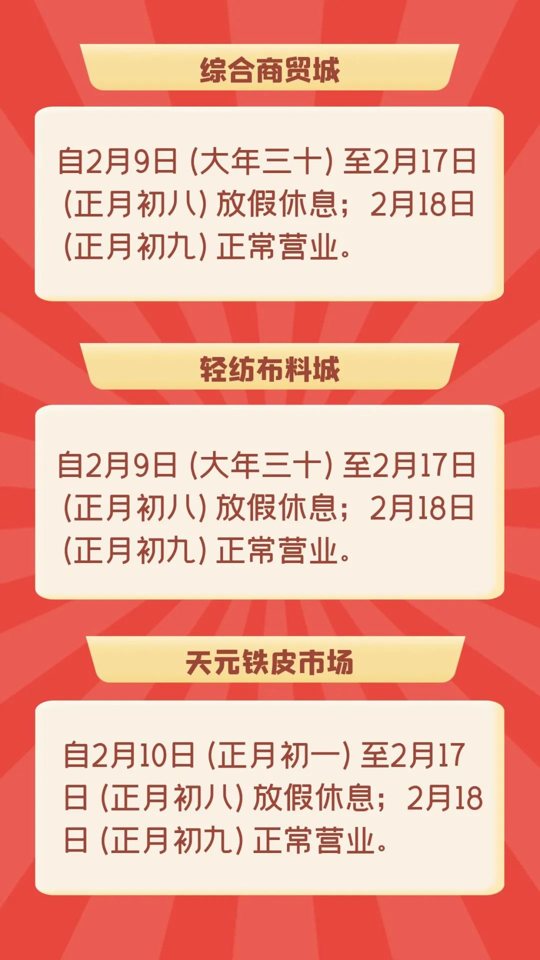 综合商贸城、轻纺布料城、天元铁皮市场春节休市通知