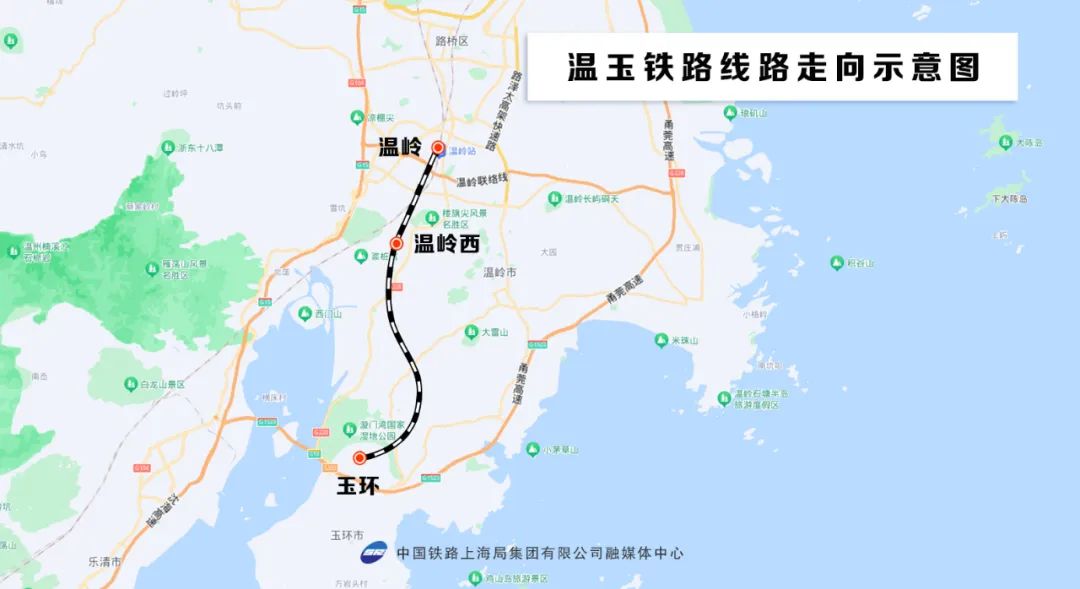 温玉铁路位于浙江省台州市南部,行经温岭、玉环两市。计时速350公里,新建正线约37.17公里,其中温岭境内约21.02公里,玉环境内约16.15公里。