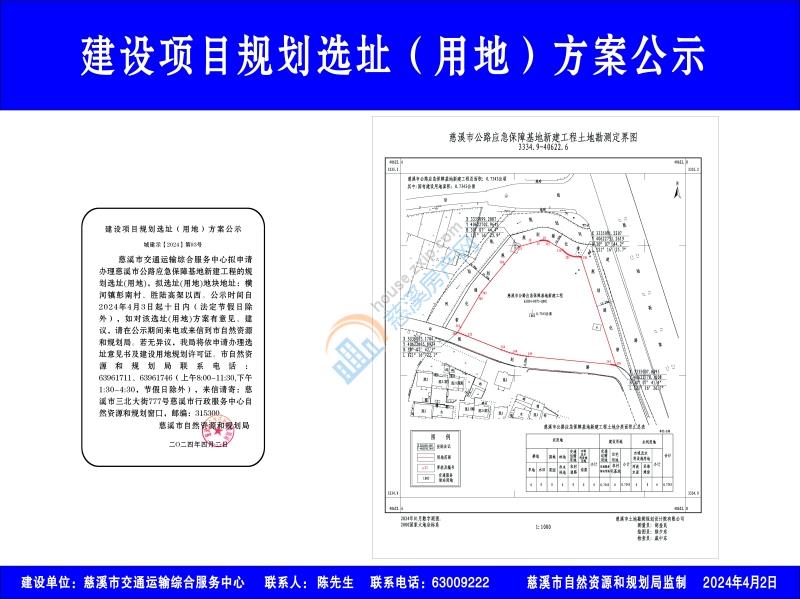 慈溪市交通运输综合服务中心拟申请办理慈溪市公路应急保障基地新建工程的规划选址(用地),拟选址(用地)地块地址:横河镇彭南村、胜陆高架以西。公示时间自2024年4月3日起十日内(法定节假日除外),如对该选址(用地)方案有意见、建议,请在公示期间来电或来信到市自然资源和规划局。若无异议,我局将依申请办理选址意见书及建设用地规划许可证。市自然资源和规划局联系电话:63961711、63961746(上午8:00-11:30,下午1:30-4:30,节假日除外),来信请寄:慈溪市三北大街777号慈溪市行政服务中心自然资源和规划窗口,邮编:315300。