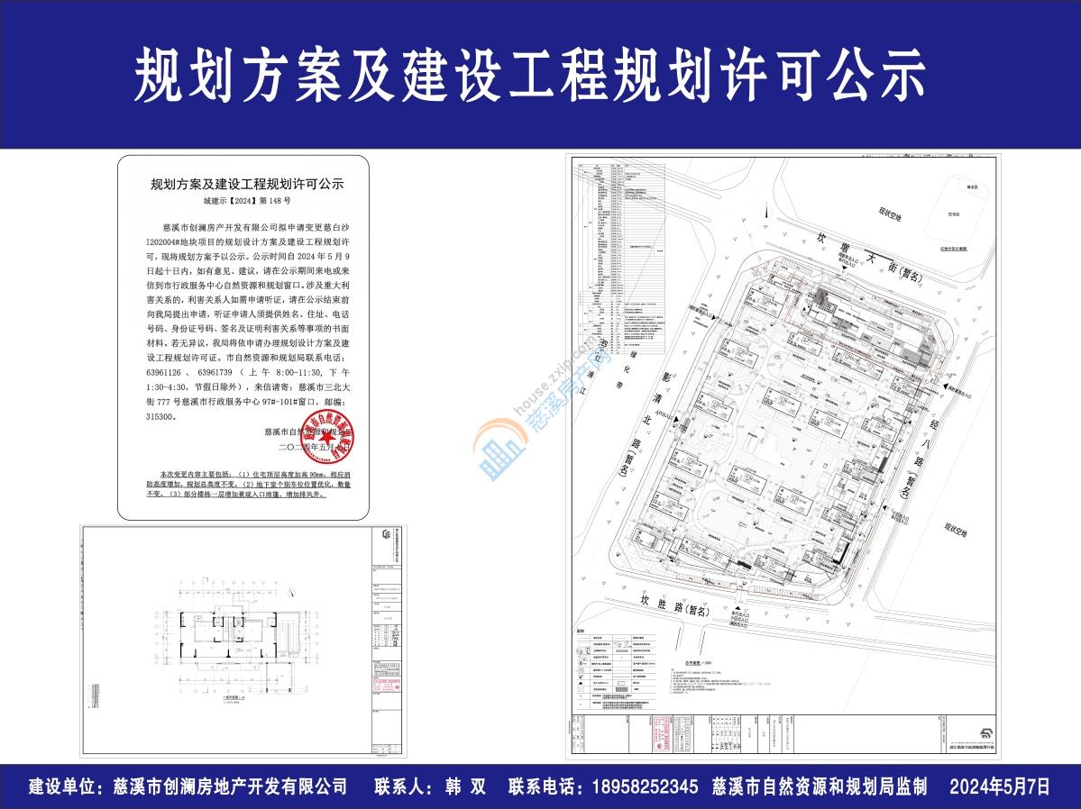 慈溪市创澜房产开发有限公司拟申请变更慈白沙I202004#地块项目的规划设计方案及建设工程规划许可,现将规划方案予以公示。公示时间自2024年5月9日起十日内,如有意见、建议,请在公示期间来电或来信到市行政服务中心自然资源和规划窗口。涉及重大利害关系的,利害关系人如需申请听证,请在公示结束前向我局提出申请,听证申请人须提供姓名、住址、电话号码、身份证号码、签名及证明利害关系等事项的书面材料。若无异议,我局将依申请办理规划设计方案及建设工程规划许可证。市自然资源和规划局联系电话:63961126、63961739(上午8:00-11:30,下午1:30-4:30,节假日除外),来信请寄:慈溪市三北大街777号慈溪市行政服务中心97#-101#窗口,邮编:315300。