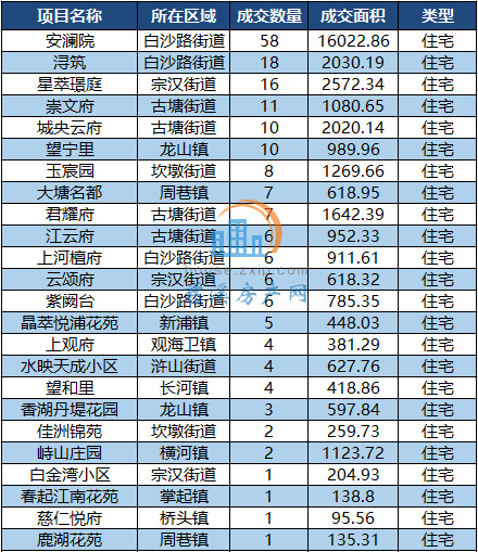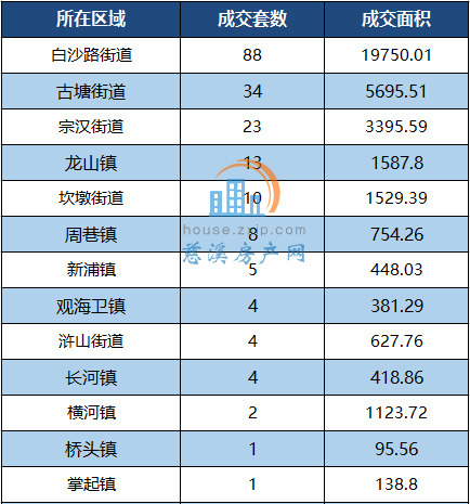 其中,白沙路街道以月成交88套居于榜首,其次是古塘街道以34套的成交量列第二。