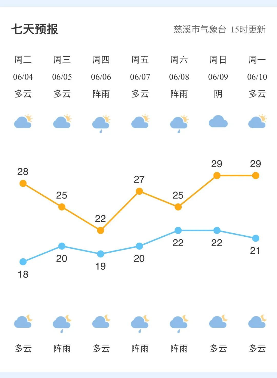 根据气象部门消息,端午节期间(6月8日至6月10日)我市以阵雨转多云为主,最低气温21℃至22℃,最高气温25℃至29℃。