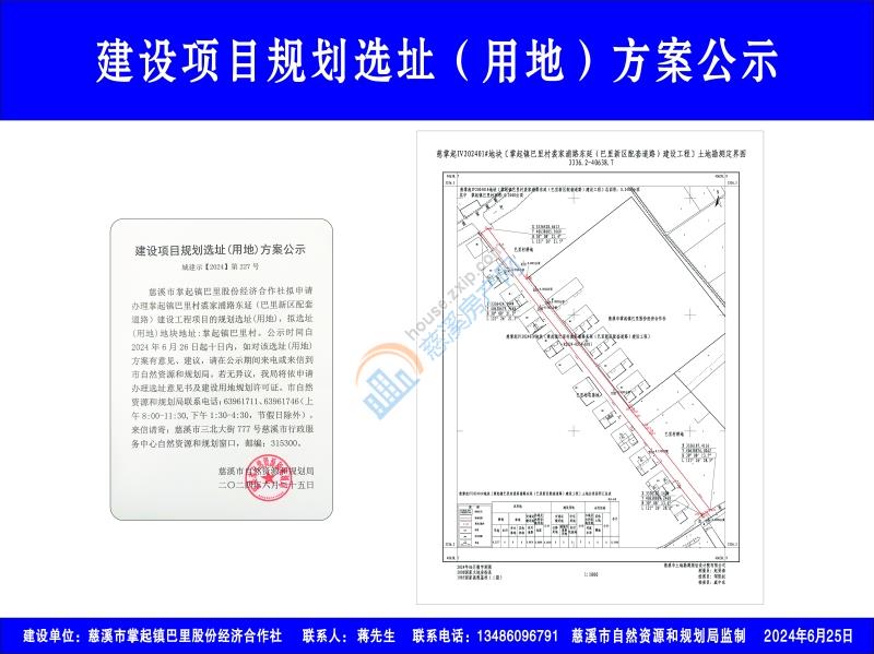 慈溪市掌起镇巴里股份经济合作社拟申请办理掌起镇巴里村裘家浦路东延(巴里新区配套道路)建设工程项目的规划选址(用地),拟选址(用地)地块地址:掌起镇巴里村。公示时间自2024年6月26日起十日内,如对该选址(用地)方案有意见、建议,请在公示期间来电或来信到市自然资源和规划局。若无异议,我局将依申请办理选址意见书及建设用地规划许可证。市自然资源和规划局联系电话:63961711、63961746(上午8:00-11:30,下午1:30-4:30,节假日除外),来信请寄:慈溪市三北大街777号慈溪市行政服务中心自然资源和规划窗口,邮编:315300。