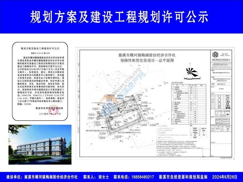 慈溪市横河镇梅湖股份经济合作社拟申请办理变更慈溪市横河镇梅湖股份经济合作社保障性租赁住房建设工程项目的规划设计方案及建设工程规划许可,现将规划方案予以公示。公示时间自2024年6月27日起十日内(法定节假日除外),如有意见、建议,请在公示期间来电或来信到市行政服务中心规划窗口。涉及重大利害关系的,利害关系人如需申请听证,请在公示结束前向我局提出申请,听证申请人须提供姓名、住址、电话号码、身份证号码、签名及证明利害关系等事项的书面材料。若无异议,我局将依申请办理规划设计方案及建设工程规划许可证。市自然资源和规划局联系电话:63961748、63961711(上午8:00-11:30,下午1:30-4:30,节假日除外),来信请寄:慈溪市三北大街777号慈溪市政务服务中心规划窗口,邮编:315300。