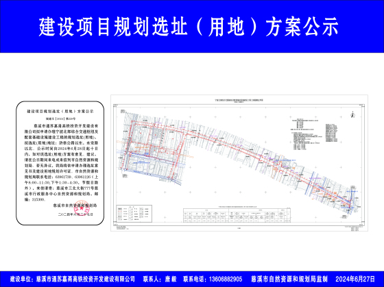慈溪市通苏嘉甬高铁投资开发建设有限公司拟申请办理宁波北部综合交通枢纽及配套基础设施建设工程的规划选址(用地),拟选址(用地)地址:浒崇公路以东,永安路以北。公示时间自2024年6月28日起十日内,如对该选址(用地)方案有意见、建议,请在公示期间来电或来信到市自然资源和规划局。若无异议,我局将依申请办理选址意见书及建设用地规划许可证。市自然资源和规划局联系电话:63961739、63961126(上午8:00-11:30,下午1:30-4:30,节假日除外),来信请寄:慈溪市三北大街777号慈溪市行政服务中心自然资源和规划局,邮编:315300。