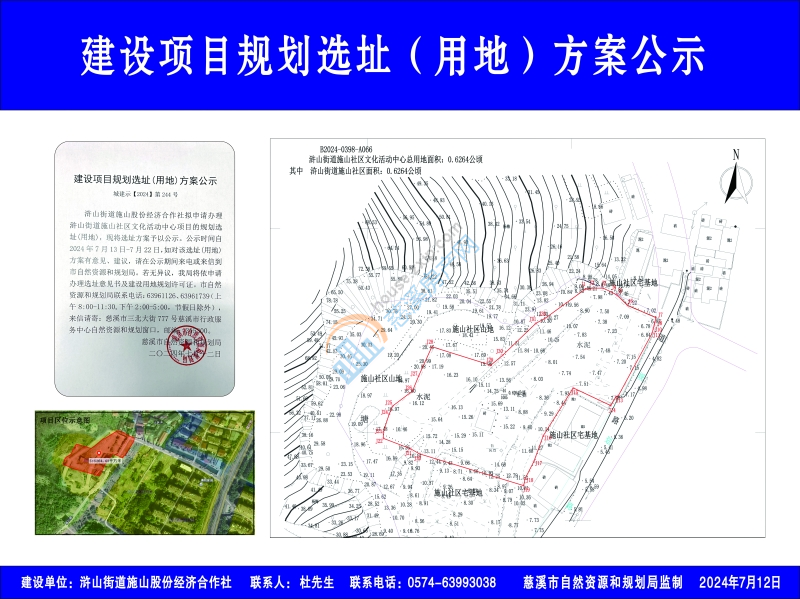 浒山街道施山股份经济合作社拟申请办理浒山街道施山社区文化活动中心项目的规划选址(用地),现将选址方案予以公示。公示时间自2024年7月13日-7月22日,如对该选址(用地)方案有意见、建议,请在公示期间来电或来信到市自然资源和规划局。若无异议,我局将依申请办理选址意见书及建设用地规划许可证。市自然资源和规划局联系电话:63961126、63961739(上午8:00-11:30,下午2:00-5:00,节假日除外),来信请寄:慈溪市三北大街777号慈溪市行政服务中心自然资源和规划窗口,邮编:315300。