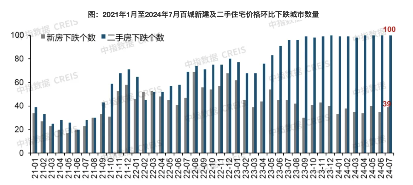 从房价涨跌城市数量看,根据中国房地产指数系统百城价格指数,7月,百城二手住宅价格环比下跌城市数量为100个,已连续4个月出现百城二手房价格集体下跌。百城新建住宅价格环比下跌城市数量为39个,较6月增加4个。