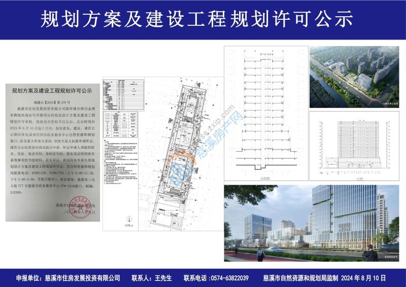 慈溪市住房发展投资有限公司拟申请办理白金湾东侧地块商业写字楼项目的规划设计方案及建设工程规划许可审批,现将相关资料予以公示。公示时间自2024年8月10日起十日内,如有意见、建议,请在公示期间来电或来信到市政务服务中心自然资源和规划窗口。涉及重大利害关系的,利害关系人如需申请听证,请在公示结束前向我局提出申请,听证申请人须提供姓名、住址、电话号码、身份证号码、签名及证明利害关系等事项的书面材料。若无异议,我局将依申请办理规划设计方案及建设工程规划许可证。市自然资源和规划局联系电话:63961126、63961739(上午8:00-11:30,下午2:00-5:00,节假日除外),来信请寄:慈溪市三北大街777号慈溪市政务服务中心97#-101#窗口,邮编:315300。