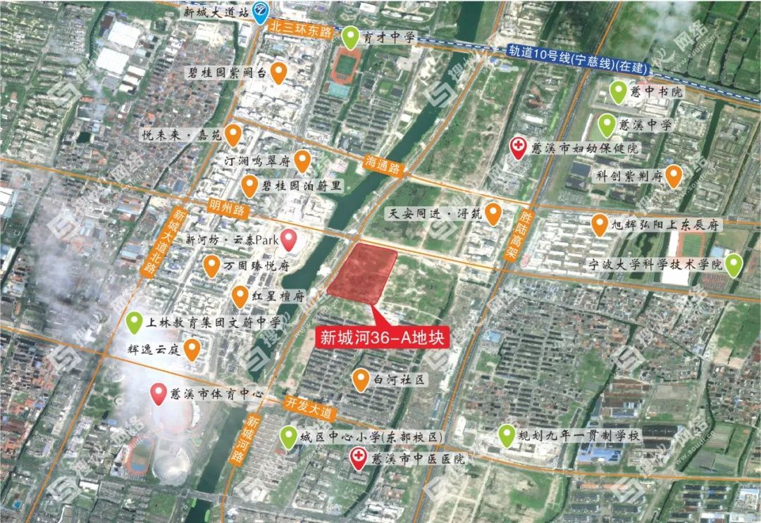 【便捷交通 未来可期】地块周边明州路、胜陆高架、开发大道、新城大道北路、新城河路等路网纵横交错,内外联系十分便利。在建的宁波轨道交通10号线(宁波至慈溪市域(郊)铁路工程)新城大道站自北侧1公里处穿过,建成后将便捷往来于慈溪、宁波城区,将慈溪中心城区与北部副城快速联系起来,对于支撑城市空间向北拓展,加快构建“一体两翼多组团”市域空间格局,和宁波都市圈发展具有重要意义。而对于新城河区块而言,未来随着该站点的通车,片区内人流、物流、资源流等将源源不断地汇聚,价值高地优势显著。