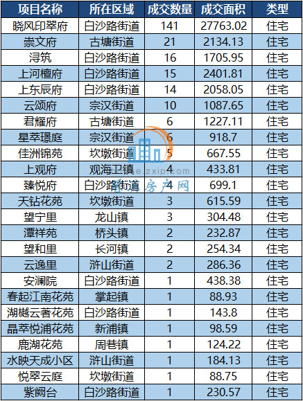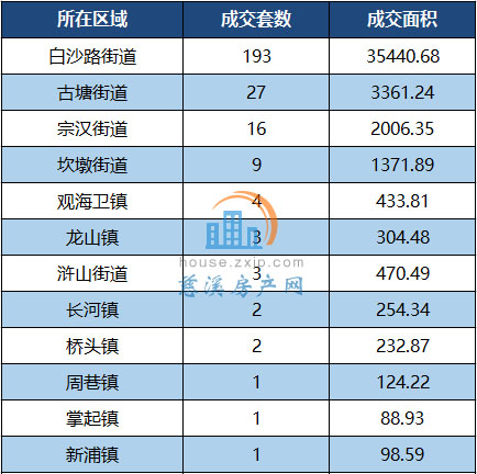 其中,白沙路街道以月成交193套居于榜首,其次是古塘街道以22套的成交量列第二。