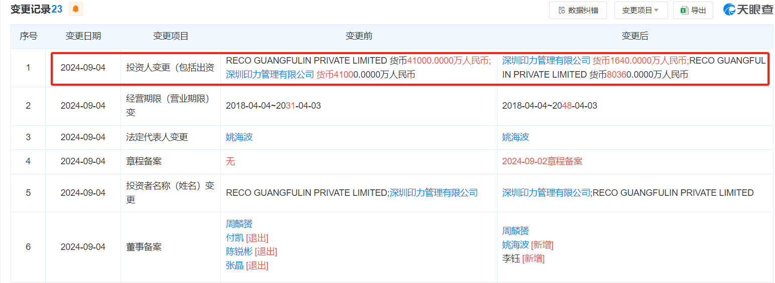 据天眼查数据显示,上海力狮企业管理有限公司(以下简称“力狮企业”)股权于近日发生变更,RECO GUANGFULIN PRIVATE LIMITED的股权比例由50%变更为98%,万科旗下深圳印力管理有限公司的股权比例从50%降至2%。