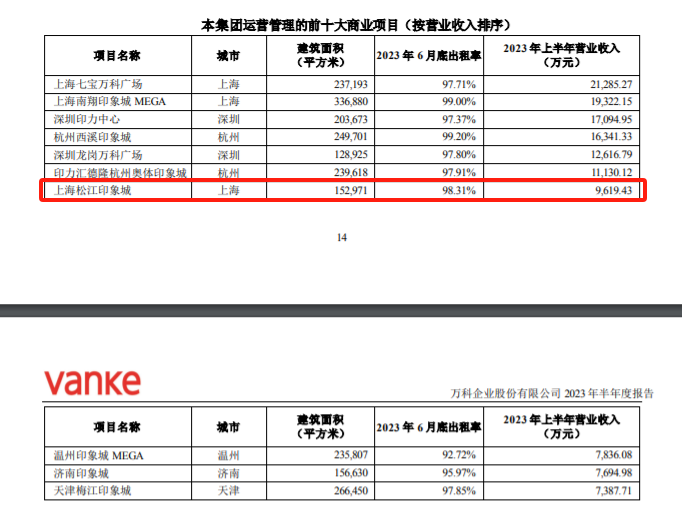 根据万科过往财报,上海松江印象城建筑面积约15.3万平方米,截至2023年6月底出租率高达98.31%,2023年上半年营业收入约9619.43万元;在万科运营管理的前十大商业项目(按营业收入排序)中,上海松江印象城位列第七,排在印力汇德隆杭州奥体印象城之后。
