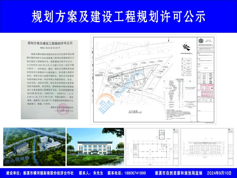 慈溪市横河镇彭南股份经济合作社拟申请办理横河镇彭南村文化礼堂新建工程项目的规划设计方案及建设工程规划许可,现将规划方案予以公示。公示时间自2024年9月11日起十日内(法定节假日除外),如有意见、建议,请在公示期间来电或来信到市行政服务中心规划窗口。涉及重大利害关系的,利害关系人如需申请听证,请在公示结束前向我局提出申请,听证申请人须提供姓名、住址、电话号码、身份证号码、签名及证明利害关系等事项的书面材料。若无异议,我局将依申请办理规划设计方案及建设工程规划许可证。市自然资源和规划局联系电话:63961748、 63961711(上午8:00-11:30,下午2:00-5:00,节假日除外),来信请寄:慈溪市三北大街777号慈溪市政务服务中心规划窗口,邮编:315300。