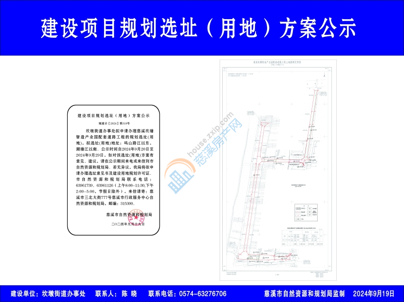 坎墩街道办事处拟申请办理慈溪坎塘智造产业园配套道路工程的规划选址(用地),拟选址(用地)地址:鸣山路江以东,潮塘江以南。公示时间自2024年9月20日至2024年9月29日,如对该选址(用地)方案有意见、建议,请在公示期间来电或来信到市自然资源和规划局。若无异议,我局将依申请办理选址意见书及建设用地规划许可证。市自然资源和规划局联系电话:63961739、63961126(上午8:00-11:30,下午2:00-5:00,节假日除外),来信请寄:慈溪市三北大街777号慈溪市行政服务中心自然资源和规划局,邮编:315300。