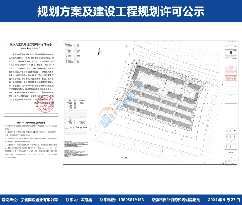 宁波奔东置业有限公司拟申请变更新城河59-B地块房地产开发项目(暂名)的规划设计方案及建设工程规划许可,现将规划方案予以公示。公示时间自2024年9月28日-2024年10月14日(不包括10月1日-10月7日),如有意见、建议,请在公示期间来电或来信到市行政服务中心自然资源和规划窗口。涉及重大利害关系的,利害关系人如需申请听证,请在公示结束前向我局提出申请,听证申请人须提供姓名、住址、电话号码、身份证号码、签名及证明利害关系等事项的书面材料。若无异议,我局将依申请办理规划设计方案及建设工程规划许可证。市自然资源和规划局联系电话:63961126、63961739(上午8:00-11:30,下午1:30-4:30,节假日除外),来信请寄:慈溪市三北大街777号慈溪市行政服务中心97#-101#窗口,邮编:315300。