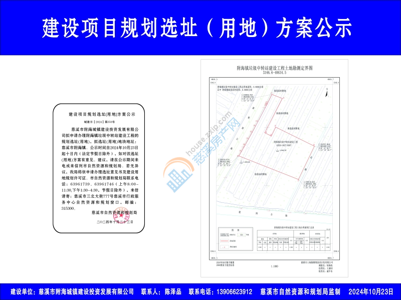 慈溪市附海城镇建设投资发展有限公司拟申请办理附海镇垃圾中转站建设工程的规划选址(用地),拟选址(用地)地块地址:慈溪市附海镇。公示时间自2024年10月23日起十日内(法定节假日除外),如对该选址(用地)方案有意见、建议,请在公示期间来电或来信到市自然资源和规划局。若无异议,我局将依申请办理选址意见书及建设用地规划许可证。市自然资源和规划局联系电话:63961739、63961746(上午8:00-11:30,下午1:30-4:30,节假日除外),来信请寄:慈溪市三北大街777号慈溪市行政服务中心自然资源和规划窗口,邮编:315300。