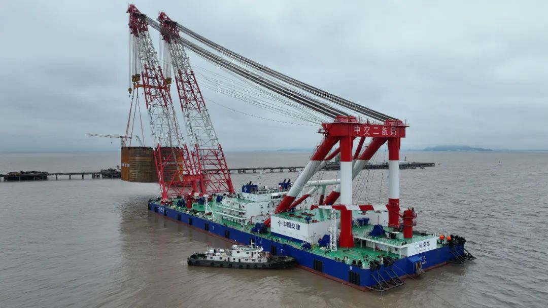 此次吊装作业的钢吊箱位于杭州湾跨海铁路大桥160号主墩,内外水头差达25米,为国内最大高度。在钢吊箱下放过程中,项目团队采用全自动化智能监控平台,动态监测、预警钢吊箱应力、姿态、高程等情况,并以三维界面进行实时场景还原,全方位展示钢吊箱姿态和受力状态,确保了整个下放过程的“万无一失”。