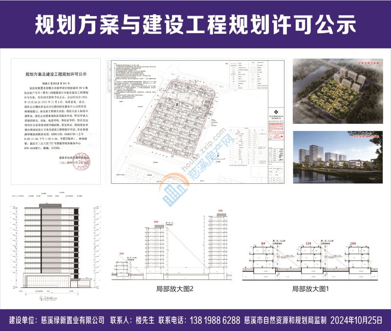 慈溪绿新置业有限公司拟申请办理新城河36-A地块房地产项目(暂名)的规划设计方案及建设工程规划许可审批,现将相关资料予以公示。公示时间自2024年10月26日-2024年11月4日,如有意见、建议,请在公示期间来电或来信到市政务服务中心自然资源和规划窗口。涉及重大利害关系的,利害关系人如需申请听证,请在公示结束前向我局提出申请,听证申请人须提供姓名、住址、电话号码、身份证号码、签名及证明利害关系等事项的书面材料。若无异议,我局将依申请办理规划设计方案及建设工程规划许可证。市自然资源和规划局联系电话:63961126、63961739(上午8:00-11:30,下午1:30-4:30,节假日除外),来信请寄:慈溪市三北大街777号慈溪市政务服务中心97#-101#窗口,邮编:315300。