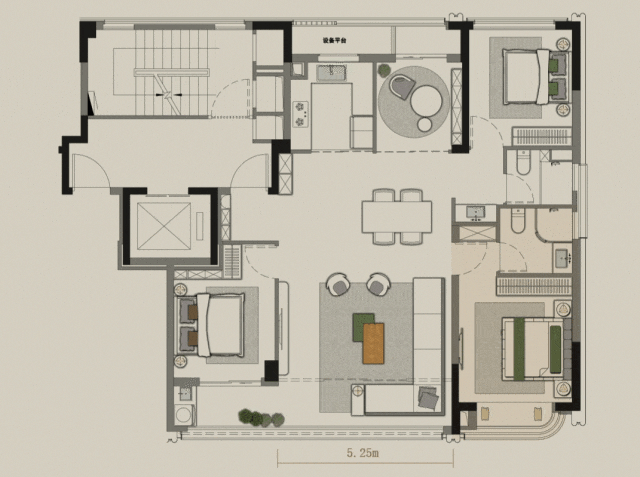 空间的尺度一直延展至卧室,所有房间面宽均达约3.05米以上,主卧套房面宽达约3.5米,且转角采用弧面玻璃过渡,形成L型转角飘窗,三面联动,犹如一方无限舒展的私域观景台,日落黄昏,沉浸这方自我领地,同鉴都会璀璨,同享园区丰盛,感受深度改善的岁月犒赏。