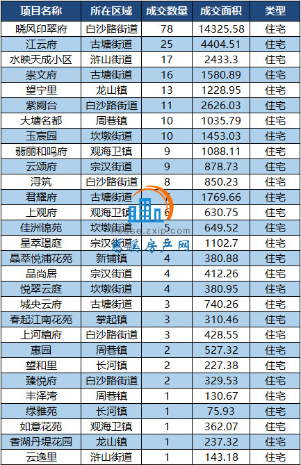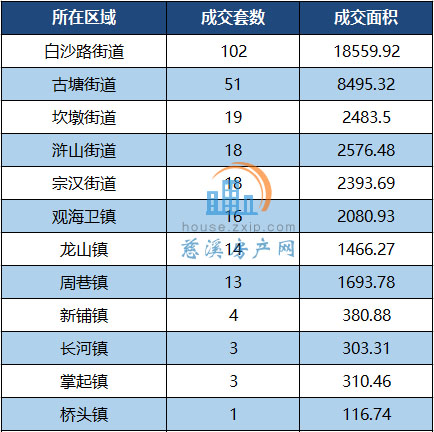 其中,白沙路街道以月成交102套居于榜首,其次是古塘街道以51套的成交量列第二。