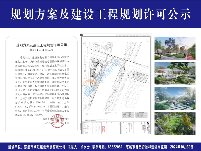 慈溪市欣汇建设开发有限公司拟申请办理慈溪开发大道路口以南市政绿地改造项目的规划设计方案及建设工程规划许可,现将规划方案予以公示。公示时间自2024年10月31日起十日内(法定节假日除外),如有意见、建议,请在公示期间来电或来信到市行政服务中心规划窗口。涉及重大利害关系的,利害关系人如需申请听证,请在公示结束前向我局提出申请,听证申请人须提供姓名、住址、电话号码、身份证号码、签名及证明利害关系等事项的书面材料。若无异议,我局将依申请办理规划设计方案及建设工程规划许可证。市自然资源和规划局联系电话:63961748、 63961711(上午8:00-11:30,下午1:30-4:30,节假日除外),来信请寄:慈溪市三北大街777号慈溪市政务服务中心规划窗口,邮编:315300。