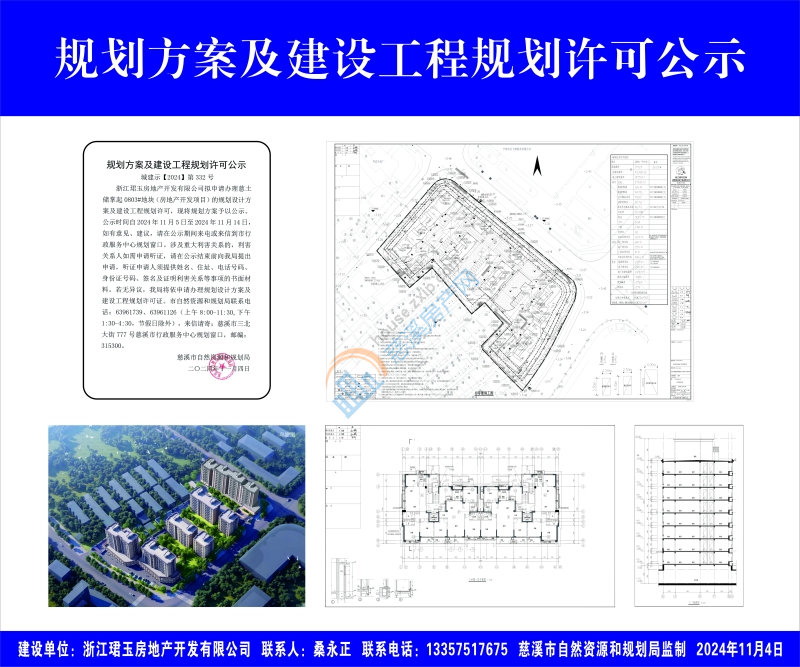 浙江珺玉房地产开发有限公司拟申请办理慈土储掌起0803#地块(房地产开发项目)的规划设计方案及建设工程规划许可,现将规划方案予以公示。公示时间自2024年11月5日至2024年11月14日,如有意见、建议,请在公示期间来电或来信到市行政服务中心规划窗口。涉及重大利害关系的,利害关系人如需申请听证,请在公示结束前向我局提出申请,听证申请人须提供姓名、住址、电话号码、身份证号码、签名及证明利害关系等事项的书面材料。若无异议,我局将依申请办理规划设计方案及建设工程规划许可证。市自然资源和规划局联系电话:63961739、63961126(上午8:00-11:30,下午1:30-4:30,节假日除外),来信请寄:慈溪市三北大街777号慈溪市行政服务中心规划窗口,邮编:315300。