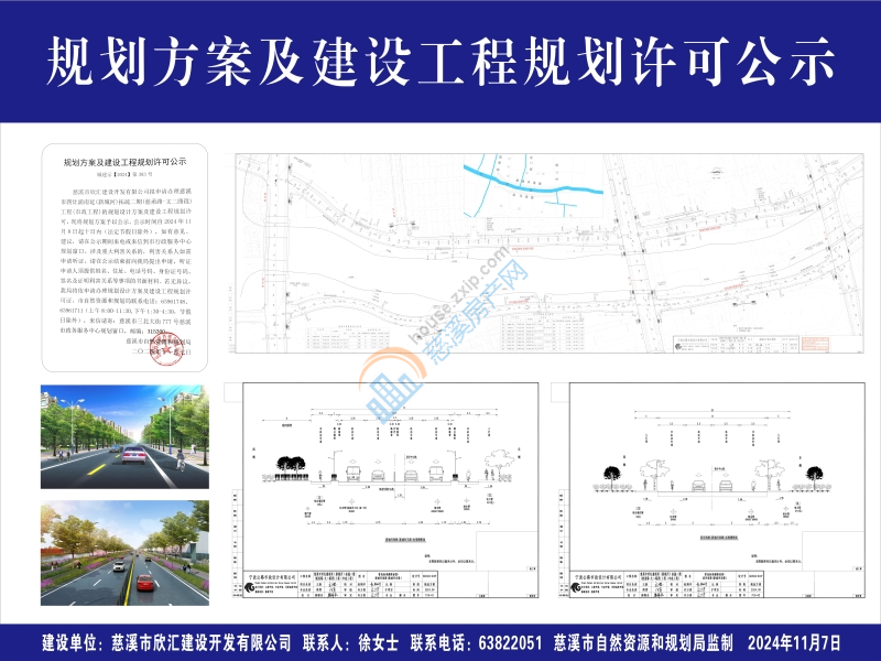 慈溪市欣汇建设开发有限公司拟申请办理慈溪市四灶浦南延(新城河)拓疏二期(慈甬路-文二路段)工程(市政工程)的规划设计方案及建设工程规划许可,现将规划方案予以公示。公示时间自2024年11月8日起十日内(法定节假日除外),如有意见、建议,请在公示期间来电或来信到市行政服务中心规划窗口。涉及重大利害关系的,利害关系人如需申请听证,请在公示结束前向我局提出申请,听证申请人须提供姓名、住址、电话号码、身份证号码、签名及证明利害关系等事项的书面材料。若无异议,我局将依申请办理规划设计方案及建设工程规划许可证。市自然资源和规划局联系电话:63961748、 63961711(上午8:00-11:30,下午1:30-4:30,节假日除外),来信请寄:慈溪市三北大街777号慈溪市政务服务中心规划窗口,邮编:315300。