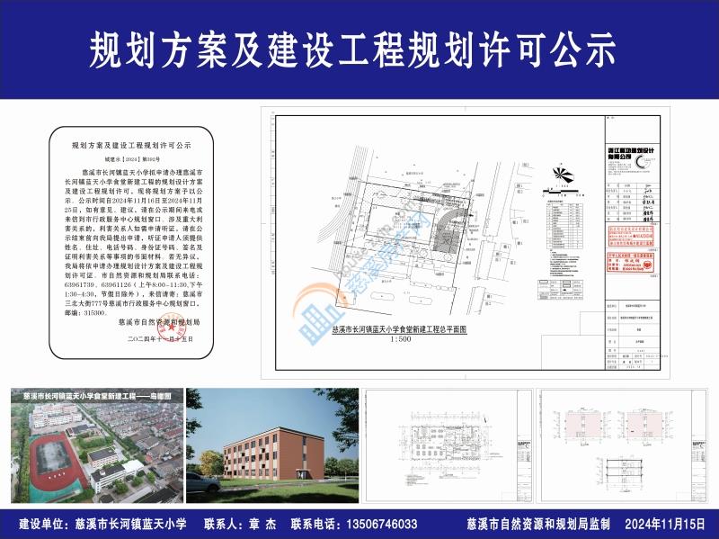 慈溪市长河镇蓝天小学拟申请办理慈溪市长河镇蓝天小学食堂新建工程的规划设计方案及建设工程规划许可,现将规划方案予以公示。公示时间自2024年11月16日至2024年11月25日,如有意见、建议,请在公示期间来电或来信到市行政服务中心规划窗口。涉及重大利害关系的,利害关系人如需申请听证,请在公示结束前向我局提出申请,听证申请人须提供姓名、住址、电话号码、身份证号码、签名及证明利害关系等事项的书面材料。若无异议,我局将依申请办理规划设计方案及建设工程规划许可证。市自然资源和规划局联系电话:63961739、63961126(上午8:00-11:30,下午1:30-4:30,节假日除外),来信请寄:慈溪市三北大街777号慈溪市行政服务中心规划窗口,邮编:315300。