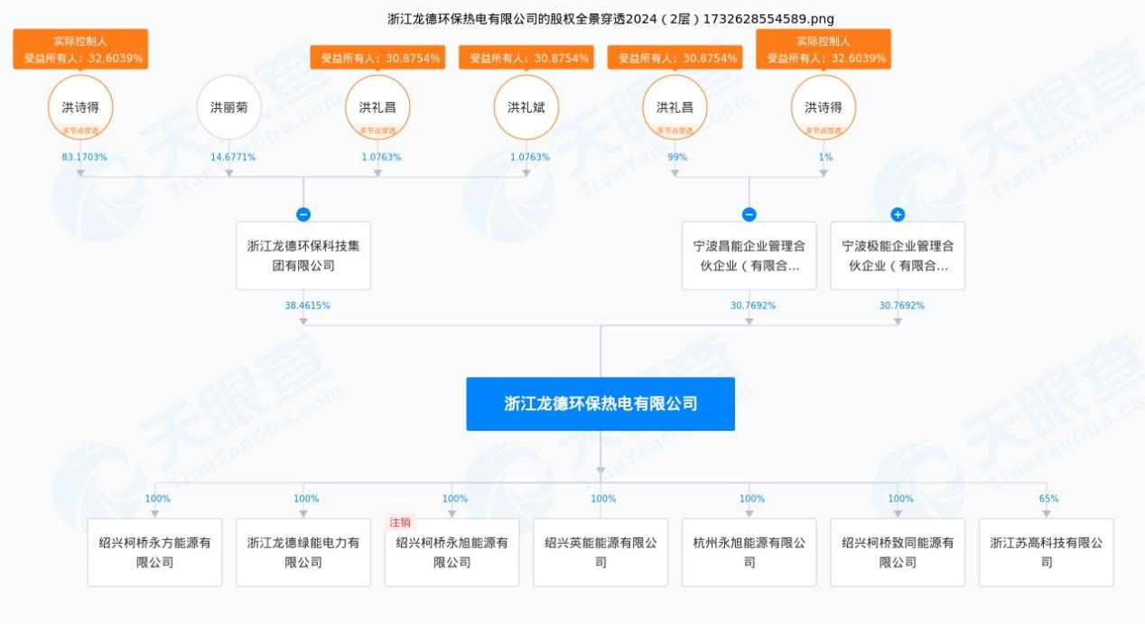 天眼查显示,洪礼昌在浙江龙德环保热电有限公司(简称“龙德环保”)担任董事,同时在龙德环保的大股东浙江龙德环保科技集团有限公司持股1.0763%,该公司股东均为洪氏。洪礼昌同时持有龙德环保第二大股东宁波昌能企业管理合伙企业(有限合伙)99%股份。其还在新三板公司成都锐思环保技术股份有限公司控股51%的杭州佳锐思环保科技有限公司持股8%。
