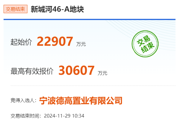 最终,22轮后,土拍顺利结束!宁波德高置业有限公司以成交总价30607万元竞得该地块,成交楼面价约13838元/平,溢价率33.61%。