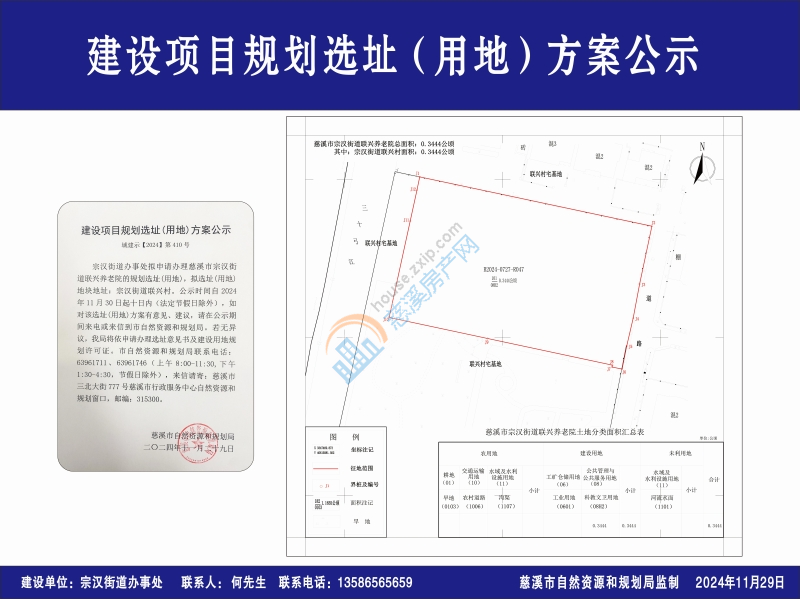 宗汉街道办事处拟申请办理慈溪市宗汉街道联兴养老院的规划选址(用地),拟选址(用地)地块地址:宗汉街道联兴村。公示时间自2024年11月30日起十日内(法定节假日除外),如对该选址(用地)方案有意见、建议,请在公示期间来电或来信到市自然资源和规划局。若无异议,我局将依申请办理选址意见书及建设用地规划许可证。市自然资源和规划局联系电话:63961711、63961746(上午8:00-11:30,下午1:30-4:30,节假日除外),来信请寄:慈溪市三北大街777号慈溪市行政服务中心自然资源和规划窗口,邮编:315300。