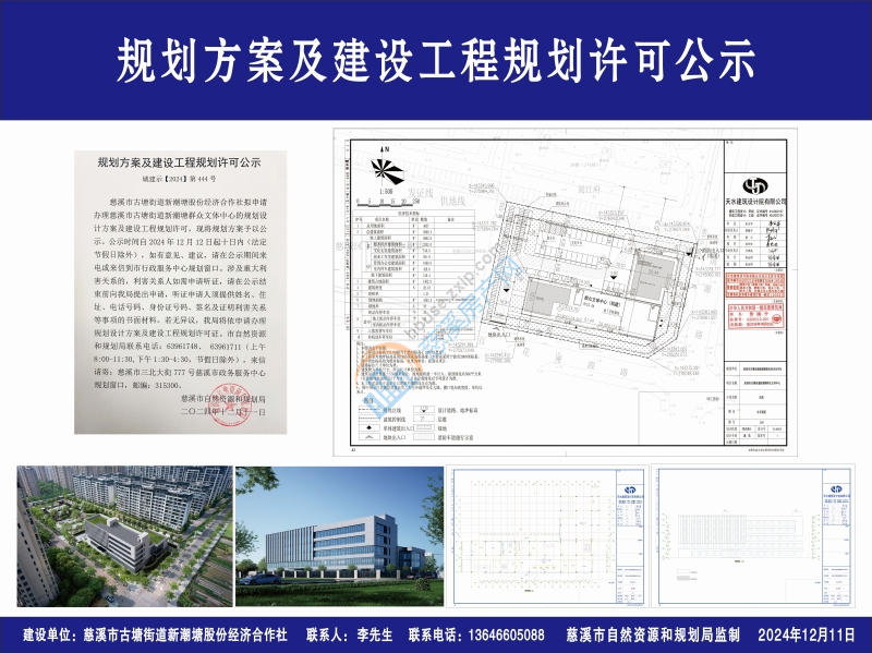 慈溪市古塘街道新潮塘股份经济合作社拟申请办理慈溪市古塘街道新潮塘群众文体中心的规划设计方案及建设工程规划许可,现将规划方案予以公示。公示时间自2024年12月12日起十日内(法定节假日除外),如有意见、建议,请在公示期间来电或来信到市行政服务中心规划窗口。涉及重大利害关系的,利害关系人如需申请听证,请在公示结束前向我局提出申请,听证申请人须提供姓名、住址、电话号码、身份证号码、签名及证明利害关系等事项的书面材料。若无异议,我局将依申请办理规划设计方案及建设工程规划许可证。市自然资源和规划局联系电话:63961748、 63961711(上午8:00-11:30,下午1:30-4:30,节假日除外),来信请寄:慈溪市三北大街777号慈溪市政务服务中心规划窗口,邮编:315300。