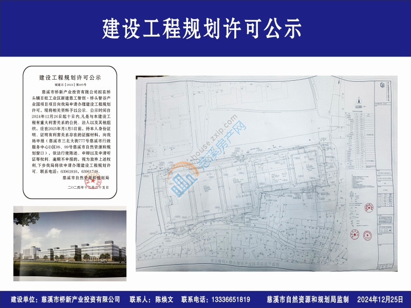 慈溪市桥新产业投资有限公司拟在桥头镇日旺工业区新建慈工智创·桥头智谷产业园项目项目向我局申请办理建设工程规划许可,现将相关资料予以公示。公示时间自2024年12月26日起十日内,凡是与本建设工程有重大利害关系的公民、法人以及其他组织,应在2025年月1月5日前,持本人身份证明、证明有利害关系存在的证据材料,向我局申报(慈溪市三北大街777号慈溪市行政服务中心D区98、99号慈溪市自然资源和规划窗口),依法行使陈述、申辩以及申请听证等权利。逾期不申报的,视为放弃上述权利,下步我局将依申请办理建设工程规划许可。联系电话:63961810,63961748。