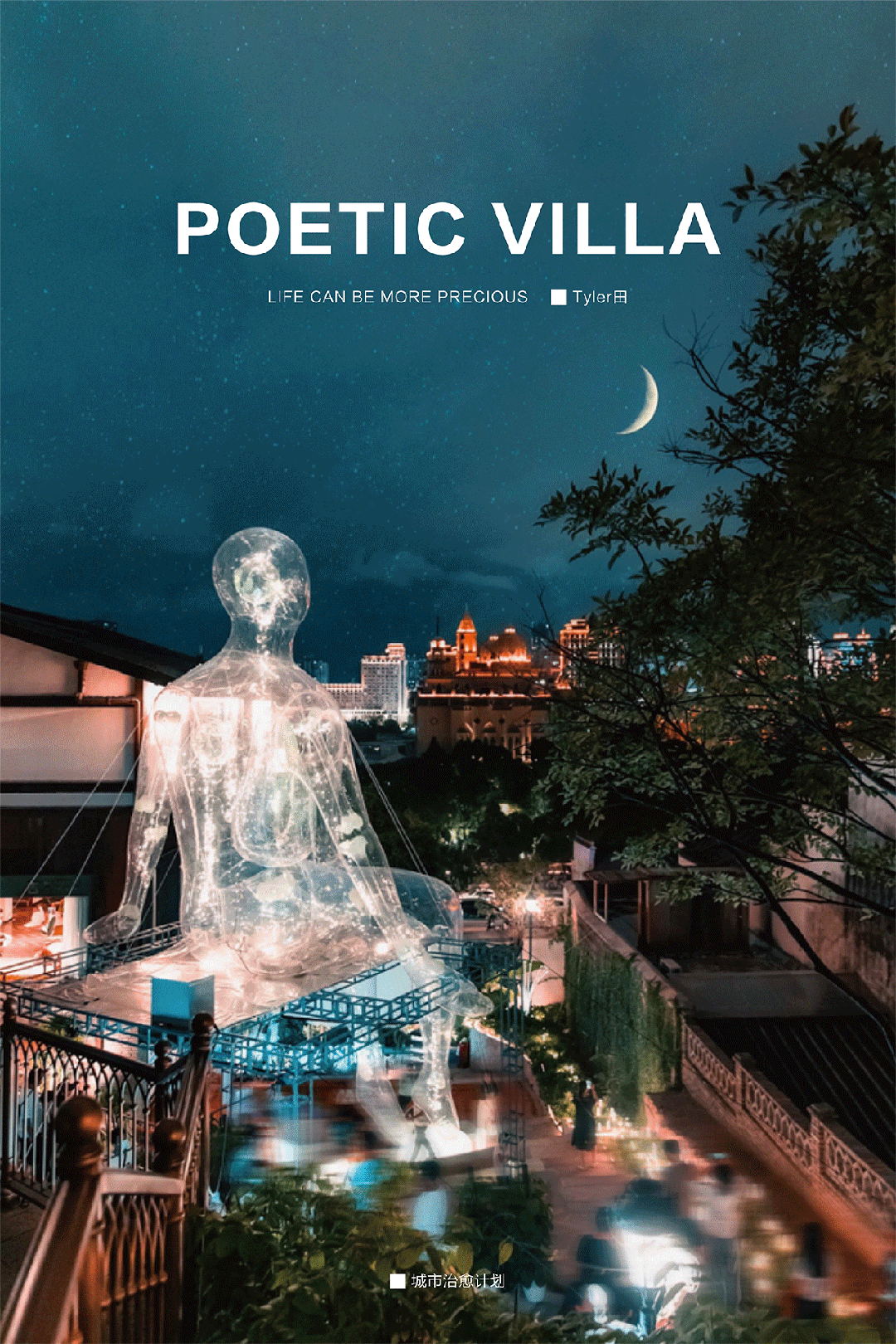 经过一年的深入思考和创作实践,“城市治愈计划”终于有了明确的想法。之前只在画纸上出现的神明,变成了姿态各异的“透明巨人”。他们在上海、广州、深圳、福州、厦门等城市现身:或是出现在潺潺流水的浮桥上、或是卧在广场上静静沉睡,或是蹲坐在城市的高空俯瞰车水马龙……治愈城市和生活在城市的人群,以唤醒人们敬畏自然和人文的本质能量。城市治愈的话题引发了全国性的持续热度,互联网话题热度达到1000万+。这次安麓携手青年艺术家Tyler田,将城市治愈「神明」装置艺术,首次带到慈溪。