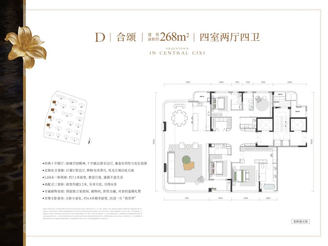 约268㎡合颂大宅,超配绿城豪宅经典双开门与十字圆厅仪制,高定巨幕U型全景舱,形成一方无界通透的LDKB领域,餐厅可规制1.8米圆桌,聚餐会客各得其所。