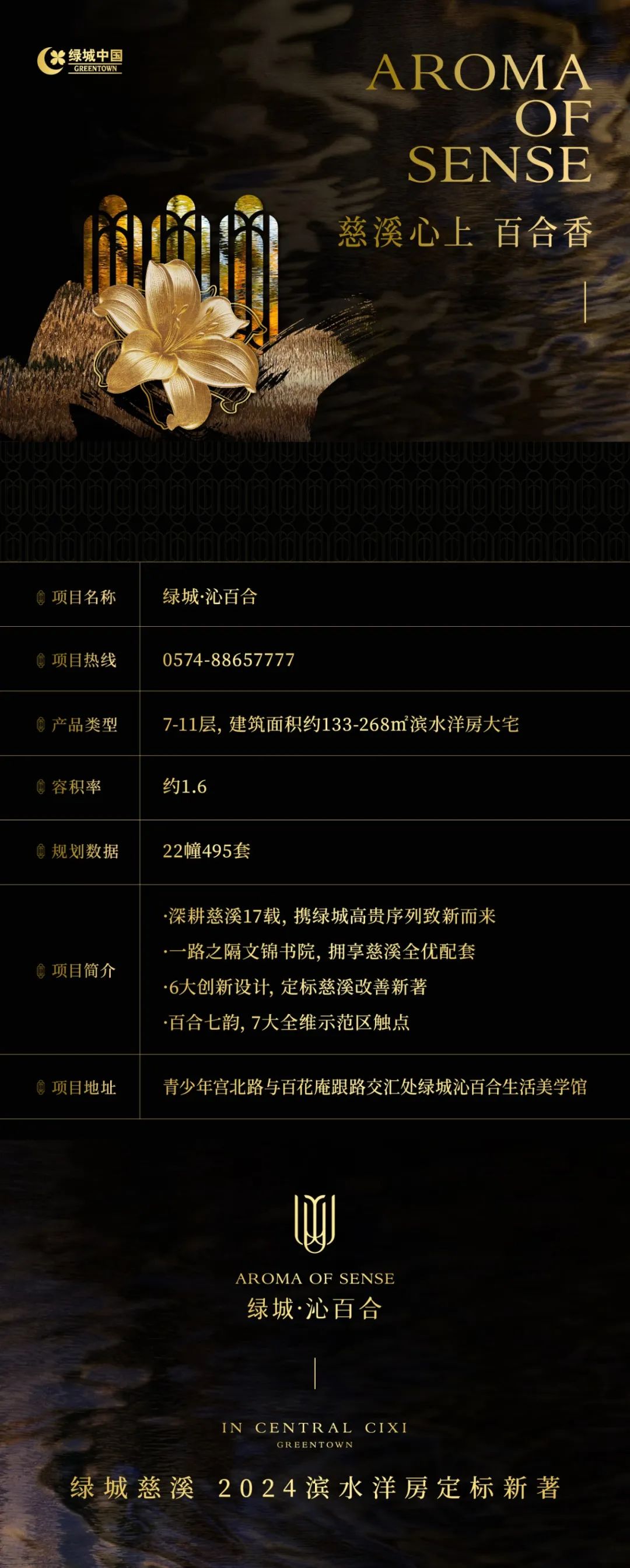 本文为要约邀请,不作为要约或承诺,本文提及的相关宣传内容不排除因政府相关规划、规定、出卖人分期规划及其他原因而发生变化,一切有关本项目及房屋的具体信息及买卖双方权利义务均以书面合同及政府最终审批文件为准。本文中提及的泛会所非报批功能描述,系指本项目部分楼栋架空层共同组成的特定功能区域。一切未列举事项或更改,不再另行通知,敬请留意最新资料。本资料的发布时间为【2025】年【1】月,有效期【3】个月,本公司保留对本资料修改的权利且不再另行通知,敬请留意最新资料。本项目核准地名为【沁百合府】,推广名为【绿城·沁百合】,开发商【慈溪浙熙房地产开发有限公司】,预售证号【慈溪房预许字(2024)第00170号】。