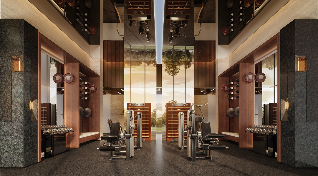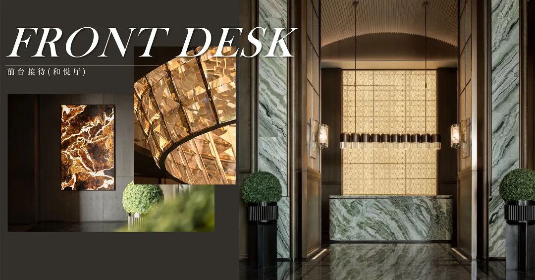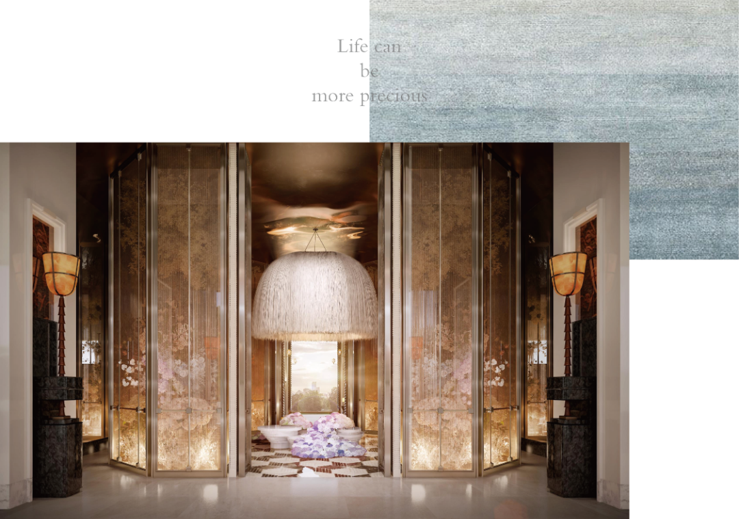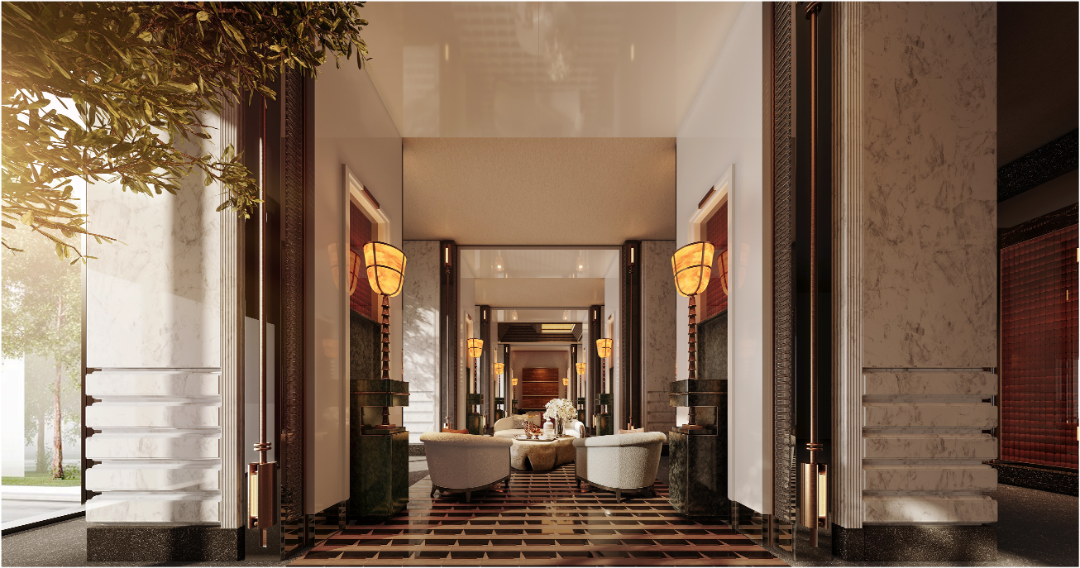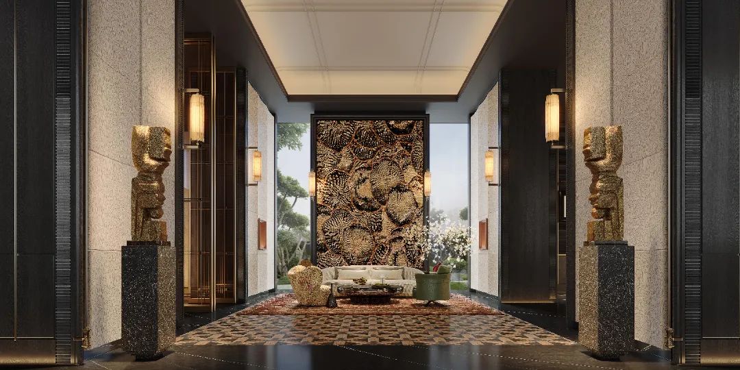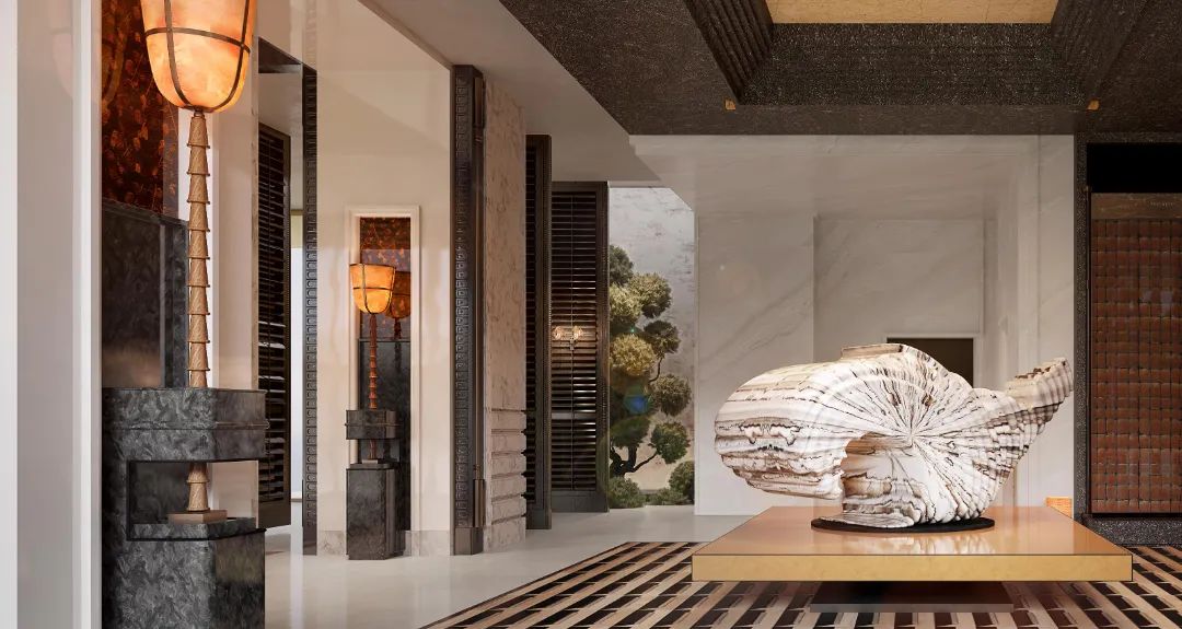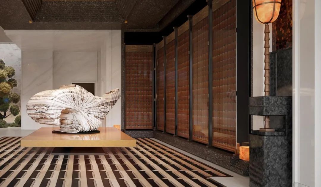 高阔的空间尺度,叠加递进的序列感,与艺术雕塑的绰约线条形成对话,诠释着盛大。无论是东方禅意轮廓、纽约安缦中汲取灵感的壁灯,多种奢石“编织”的艺术云石拼花地面,极具现代主义的幻境雕塑,以及奢石铺就的迎宾柱体阵列,无一不在诉说着顶层人群的仪仗。华丽的会所大堂,耸立着“帕拉第奥式柱子”奢石立柱,饶富16世纪意大利建筑韵味,营造出一种庄重、奢华的氛围。