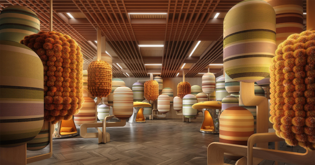 温暖、柔软、甜意、安全……是安麓“巧克力梦马空间”的设计核心思想,第一眼看上去以为“查理和巧克力工厂”的既视感,仿若蒂姆·波顿的灵感涌现。椭圆形的几何装置,通过充满艺术美感和智慧的设计,满足孩子兴趣与娱乐需求。散落的蘑菇小屋可以让孩子们随心地探索,天马行空地自由的冒险,享受亲子时光。