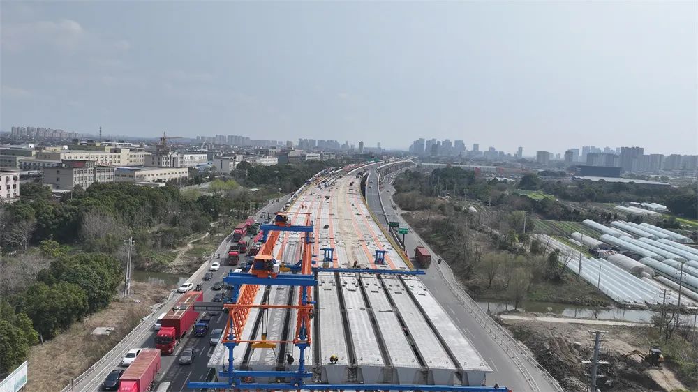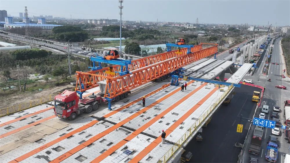 为顺利完成此次施工任务,项目部提前谋划、制定专项方案、安排专人专管。自1月15日首片梁板精准落位以来,克服不利天气等因素,各参建团队协同合作,确保了梁板架设整体过程安全、平稳、有序,圆满完成96榀小箱梁架设任务。“目前,该区域已进入桥面铺装施工阶段。接下来,将加快地面施工进程,尽早开放地面交通。”慈溪中横线快速路(二期)项目副总工朱跃昌介绍到。