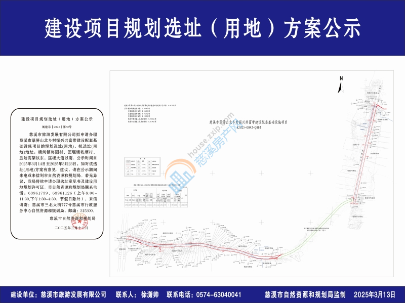 慈溪市旅游发展有限公司拟申请办理慈溪市翠屏山北乡村振兴共富带建设配套基础设施项目的规划选址(用地),拟选址(用地)地址:横河镇梅园村,匡堰镇乾炳村,胜陆高架以东,匡堰大道以南。公示时间自2025年3月14日至2025年3月23日,如对该选址(用地)方案有意见、建议,请在公示期间来电或来信到市自然资源和规划局。若无异议,我局将依申请办理选址意见书及建设用地规划许可证。市自然资源和规划局联系电话:63961739、63961126(上午8:00-11:30,下午1:30-4:30,节假日除外),来信请寄:慈溪市三北大街777号慈溪市行政服务中心自然资源和规划局,邮编:315300。
