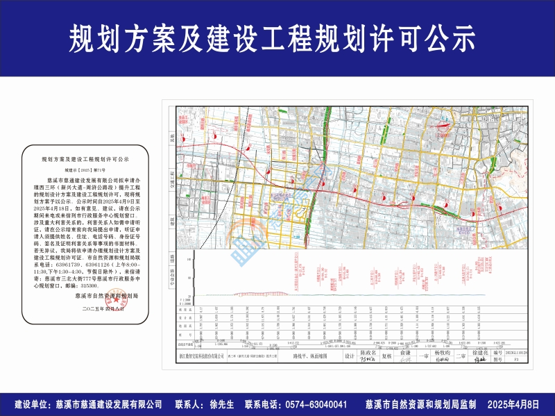 慈溪市慈通建设发展有限公司拟申请办理西三环(新兴大道-周浒公路段)提升工程的规划设计方案及建设工程规划许可,现将规划方案予以公示。公示时间自2025年4月9日至2025年4月18日,如有意见、建议,请在公示期间来电或来信到市行政服务中心规划窗口。涉及重大利害关系的,利害关系人如需申请听证,请在公示结束前向我局提出申请,听证申请人须提供姓名、住址、电话号码、身份证号码、签名及证明利害关系等事项的书面材料。若无异议,我局将依申请办理规划设计方案及建设工程规划许可证。市自然资源和规划局联系电话:63961739、63961126(上午8:00-11:30,下午1:30-4:30,节假日除外),来信请寄:慈溪市三北大街777号慈溪市行政服务中心规划窗口,邮编:315300。