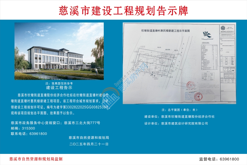 慈溪市坎墩街道直塘股份经济合作社拟在坎墩街道直塘村建设坎墩街道直塘村惠民楼新建工程项目,该工程符合城市规划要求,已申领建设工程规划许可证,编号为建字第3302822025GG0082539号,现将该项目规划总平面图、效果图予以告示。